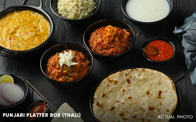 Paneer Subji + Veg Subji [150 gm] + Tandoori Butter Roti [2 Pieces] + Dal Tadka [100gm] + Jeera Rice [100 gm] + Butter Milk [300 ml] + Roasted Papad [1 Piece] + Pickle & Lemon [50 gm] + Onion Salad [50 gm]